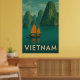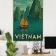 Capture the serene beauty of Vietnam with this vintage-style poster, featuring a tranquil lake, lush hills, and a traditional junk sailboat against a picturesque horizon. This retro-designed art print highlights the exotic Southeast Asian landscape, perfect for travel enthusiasts, nature lovers, or anyone seeking to add a touch of cultural heritage and tropical charm to their home or office decor.