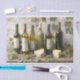 This elegant still life captures the timeless romance of wine culture with exquisite attention to detail. The composition artfully arranges aged wine bottles with their weathered labels against a softly textured backdrop, complemented by fresh vine leaves and artisanal cheeses. The piece demonstrates masterful technique in capturing the translucent qualities of the glass bottles and the subtle play of light across their surfaces.