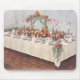 Vintage illustration food and beverages image featuring a wedding banquet table set for dinner, decorated with flowers and candles and ready for the party.