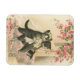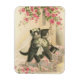 A vintage illustration of bride and groom cats on their wedding day. They walk on hind legs in their wedding attire, the bride carrying a bouquet, along a rose petal strewn path. An arch of pink roses hangs above them.