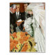 Vintage illustration love and romance design featuring a bride and groom getting married. An officiant or priest is performing the wedding ceremony. There are many floral arrangements surrounding them and the bride is holding a big beautiful bouquet of white flowers.