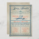 This 5" x 7" wedding invitation has a vintage, old fashioned feel with old-timey letter design, including elaborate script elements, a decorative banner, l stars and a swirly ampersand. The text reads: "You're Invited to the wedding of [customisable name] & [customisable name] [customisable date] [customisable time]. Please Join Us for an Unforgettable Celebration". Further personalise the invitation with the wedding ceremony and reception information and address, each in their own box with dotted border.