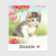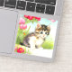 Sticker featuring a cute white and brown kitten! This blue eyed kitty sits in green grass surrounded by beautiful pink and red flowers. A good gift for cat lovers and Victorian art enthusiasts!