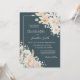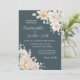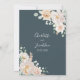 A vintage floral style invitation for your spring or summer wedding with delicate creamy white and blush flowers, pastel greenery, navy blue background and modern handwritten style text.