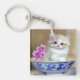 Keychain featuring a fluffy white kitten! The blue eyed kitten sits in a blue bowl with pink flowers. A purple flowered blanket is draped in front. A marvellous gift for cat lovers and Victorian art enthusiasts!