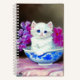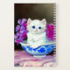 Notebook featuring a sweet white kitten! This fluffy cat poses in a blue bowl decorated with pink flowers. A wonderful gift for cat lovers and Victorian art enthusiasts!