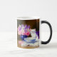 Magic Mug featuring a beautiful white kitten wearing a purple ribbon! This fluffy kitty poses next to a blue bowl and a vase of pink, purple, and white flowers. A marvellous gift for cat lovers and Victorian art enthusiasts!