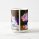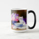 Magic Mug featuring a beautiful white kitten wearing a purple ribbon! This fluffy kitty poses next to a blue bowl and a vase of pink, purple, and white flowers. A marvellous gift for cat lovers and Victorian art enthusiasts!