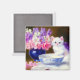 Magnet featuring a beautiful white kitten wearing a purple ribbon! This fluffy kitty poses next to a blue bowl and a vase of pink, purple, and white flowers. A marvellous gift for cat lovers and Victorian art enthusiasts!