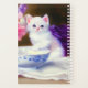 Planner featuring a beautiful white kitten wearing a purple ribbon! This fluffy kitty poses next to a blue bowl and a vase of pink, purple, and white flowers. A marvellous gift for cat lovers and Victorian art enthusiasts!