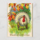 This vintage postcard features a white turkey standing in a grassy field with leaves above.
