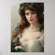 Digital art print features a beautiful woman in white with winter foliage in a vintage style portrait. A lovely Christmas themed portrait created with AI generating software