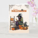 Step into a world of mystery and magic with this vintage, watercolor Halloween greeting card. At the centre, a modern dressed witch reads tarot cards while her black cat sits beside her. She is surrounded by pumpkins and a bookshelf. Cobwebs droop from ceiling and a spider walks on Halloween sign, completing this captivating scene.