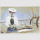 Fashion Illustration by Spanish artist Cecilio Plá y Gallardo depicts a woman in Victorian clothing sitting on the edge of a yacht holding a black vintage camera.
