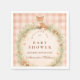 A charming woodland-inspired baby shower design featuring a sweet watercolor fox resting above a delicate floral wreath. Soft greenery, tiny mushrooms, and wildflowers create a cozy forest frame, finished with a warm bow and a soft peach gingham background. The vintage storybook illustration style and gentle earthy palette give the design a whimsical woodland nursery feel, perfect for celebrating a little one in a warm and magical forest setting.