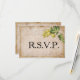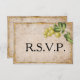 This antique-look wedding RSVP features a vintage, shabby chic brown paper pattern with a distressed look. There is an elegant gold border around the edge, with a pretty sprig of yellow berries in the corner.
