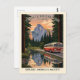 A vintage red tour bus drives along a road reflecting in a calm river, with a majestic mountain and trees in the background.
