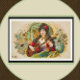 Pretty vintage postcard with a young woman, possibly a gypsy, playing the guitar. The wonderful colours are teal and aqua blue, rose red, peach, gold, lilac, black and cream. The beautiful figure is surrounded with lovely floral decoration. This image is dated 1870-1890 and was featured on a tobacco label. The original image resides with The New York Public Library Digital Collections. The image here has been enhanced and framed.