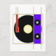 A stylised vinyl disk is the centre of a graphic composition, flanked by speakers in a blue hue and a tint in red hue. The design is encapsulated on a white border and set against a neutral white background, projecting a modern, minimalist atmosphere.