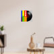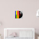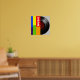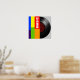 Half of a black vinyl record in a colourful cover of vertical large stripes written MUSIC