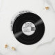 A retro vinyl record style round paper Save the Date card for your wedding with a soft grey label. This fun custom card features a vinyl record image on one side with an album title "Save the Date" in a retro script and your names. It has all the essential details: date, location, website (text and QR code).