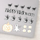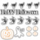 Halloween themed cut out stickers. Orange Jack-O-Lantern (1 large, 4 small). Remainder in black: 5 cats, 5 flying witches, one ghost, and text "Happy Halloween"