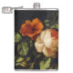 Vintage Still Life with Roses by Elias van den Broeck on Black. This old masterpiece oil on canvas painting shows red roses a butterfly and a snail.