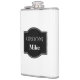 Vinyl wrapped flask is shown in a black and white design with a sample groom name.