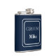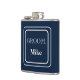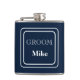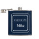 Vinyl wrapped flask is shown in a solid colour of navy blue with a sample groom name.