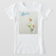 : The T-shirt features a simple and elegant design with a floral graphic. The graphic consists of a stylised flower with two blossoms, one larger than the other, connected by a slender green stem with leaves. The colour palette is soft, featuring pastel shades of orange, black, and green. Above the flower, the word “Flower” is written in cursive script with a blue hue that adds to the delicate aesthetic of the design. The background is plain white, which accentuates the minimalism and sophistication of the image.