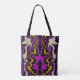 Shades of violet in glass-patterned textures on a black background with beige and orange resembles a Rorschach image.
