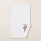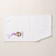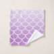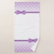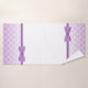 Pretty girl's bath towel set featuring violet mermaid scales. The hand towel is done in white with a cartoon brunette and purple mermaid and purple custom text ready to personalise. The bath towel is done in white, with violet scales, on both ends of the towel, with a purple band and bow border. Lovely towel set for any young girl.