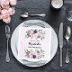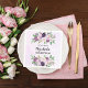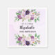 A soft watercolored violet background. Personalise and add a date, name and age. The text: The names are written in dark rose gold with a modern hand lettered style script. Decorated with watercolored flowers, roses in pink, lavender and purple.