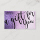 This is the perfect gift certificate business card for a trendy, stylish, girly, and modern businesswoman. This design features a simple black handwritten brush script typography on a faux printed magenta-purple into rose pink into blush pink sparkly glitter ombre gradient glamourous and chic background. It's the perfect way to allow your customers to buy a gift for their family and friends and at the same time promote your business.