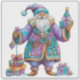 Amidst a winter wonderland, a joyful Santa dressed in vibrant violet attire holds colourful wrapped gifts and a decorative tree.