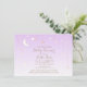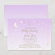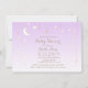 Soft and dreamy baby shower invitation features crescent moon and scattered dainty gold and white stars over gradient purple and white background. Click to customise further to change font style and colour.