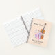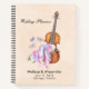 A spiral notebook wedding planner personalised with the bride and groom's names, wedding date and city. Illustrated with a watercolor image of a wooden violin, some pink ballet slippers resting against it and decorated with flowers and butterflies.  Set on a peach pink coloured background.