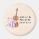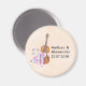 Wedding names and date magnet with a soft feminine design. Illustrated with a watercolor image of a wooden violin, some pink ballet slippers resting against it and decorated with flowers and butterflies. Set on a peach pink coloured background.