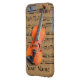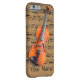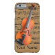 A custom phone case for the violinist or the music lover, it shows a beautiful photographic image of a violin on a light brown background with musical notes printed on it for a vintage sheet music look. A template area is included for your personalised name or text.