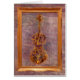 A line drawing of a violin comprised of ornamental flourishes and scrolls hangs in a carved wooden frame on a painted wood background