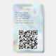 A minimalist modern design with elegant font for custom name and event information. Classic black font with your details on a chic Mylar holographic rainbow background. The name badge can be customised with your name, contact information and social media handles. The QR code can be customised to direct to your website.