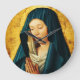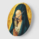 The plain and dark background contrasts with the Virgin's radiant bowed head and the white headdress covering it, and her hands are gently closed together