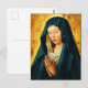 The plain and dark background contrasts with the Virgin's radiant bowed head and the white headdress covering it, and her hands are gently closed together