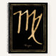 Stylised gold hammered Virgo astrology zodiac birthday symbol in a hand drawn gold double line frame. A hardcover or softcover notebook with your choice of inside pages. Choose from sketchbook, bullet journal, checklist, graph paper, recipe book, or lines in various widths and colours. Customisable. Aquarius text in a fine script on the front cover can be personalised, text can also be added on the back.