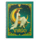 Notebook in a woman in flowing white robes, with a flower in her hair, sitting gracefully on a golden crescent moon, surrounded by stars. Ornate Art Nouveau framing with flowers, and the word “VIRGO”, complete the celestial zodiac illustration.