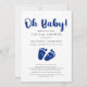 Celebrate the modern mummy-to-be from a long distance with a virtual online baby shower. This simple and minimal gender neutral baby shower invitation features "Oh Baby!" in a navy blue stylish brush script and a coordinating navy blue watercolor of baby feet. You can easily personalise with the online shower details, including an online access link, registry information, where to send cards and gifts or the option to open online and send later, and where to get more information.