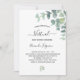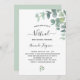 For a virtual Baby Shower. A chic white background. Decorated with white eucalyptus greenery, leaves and sprigs. Personalise and add a name and party details. Black letters. The text: Baby Shower and the name of the mum to be are written with a modern hand lettered style script.