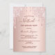 A girly and feminine virtual 21st (or any age) birthday party invitation. On front: A rose gold faux metallic, foil looking background. Decorated with rose gold and pink faux glitter drips, paint dripping look. Personalise and add a name and Zoom/Skype party details. The name and the text: Virtual are written with a hand lettered style script, dark rose gold coloured letters.