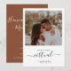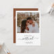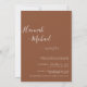Rustic minimalistic design features modern script , botanical floral leaf with photo, and terracotta colour on back of card. Easily personalise your information of choice. Ideal simple wedding invitation for a virtual online wedding.