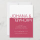 Experience the perfect blend of modernity and whimsy with this unique wedding invitation. The invitation showcases a stunning combination of viva magenta and white colour blocks, creating a visually striking design. The bride's name is written in magenta on the white block, while the groom's name stands out in white on the magenta pink block, placed upside down for an unexpected effect. The minimalist font and elegant layout highlight the colour combination and unique arrangement. The back of the invitation features the couple's initials in white on a magenta background, adding sophistication to the overall design.